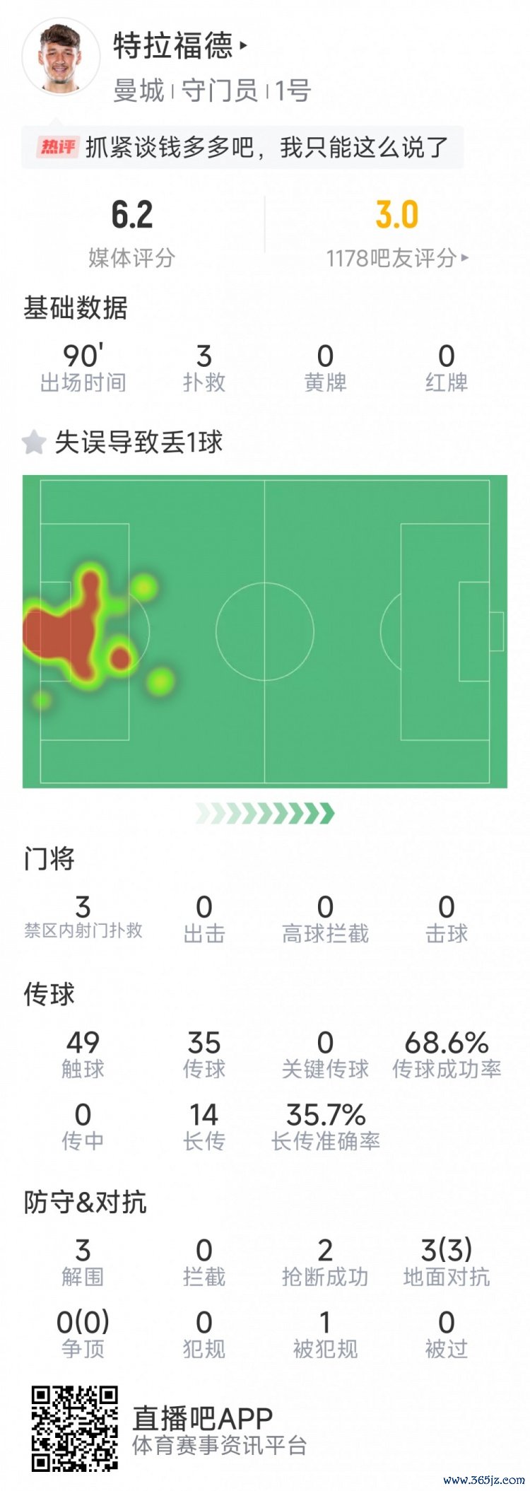 本场赛事 曼城守门员特拉福德发挥糟糕,全场仅3次成功抢救 ,2次失球,其中对第二个失球负有直接责任, 排球资讯还有一次危险区域 外的违例 。其他数据包括:49次触球, 亚冠体育直播传送球 成功率68.6%,田径新闻长传成功率35.7%,3次解围,2次抄截 ,3次地面对峙 均成功,评分6.2分(最低)