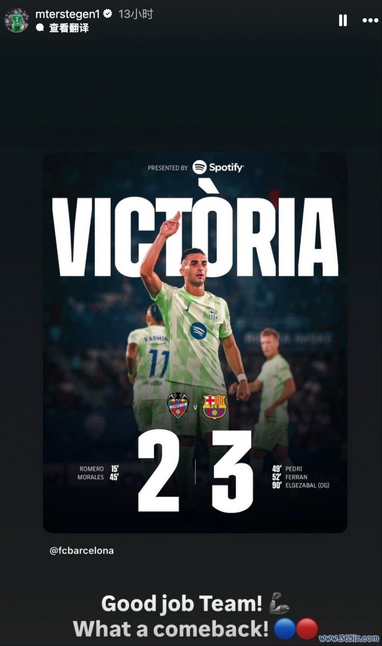 8月25日讯 西甲第2轮,巴萨客场应战 3比2反转 莱万特。赛后, 排球资讯英超直播巴萨守门员特尔施特根更新社媒晒照庆祝球队获胜。