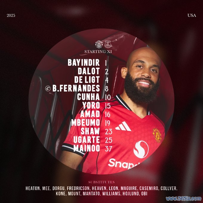曼联杆位:1-巴因迪尔、2-达洛特、4-德里赫特、23-卢克-肖、15-约罗、25-乌加特、8-B费、10-库尼亚、37-梅努、16-阿玛德、19-姆贝莫