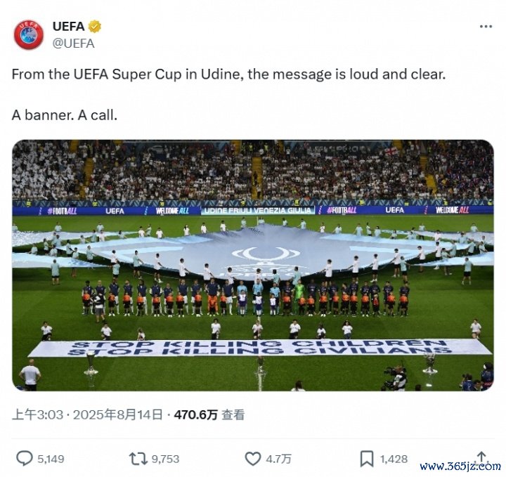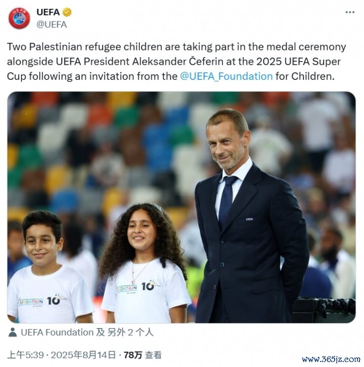 欧足联官方在社交平台上配文写道:“来自乌迪内的欧洲超级杯现场,田径新闻这则信息响亮且清晰, 排球资讯直播吧一面标语, 亚冠一次号召。”这一标语并没有明确针对的对象,但欧足联在活动期间还邀请了两名来自巴勒斯坦的难民儿童参加颁奖典礼 ,指向性十分明确。