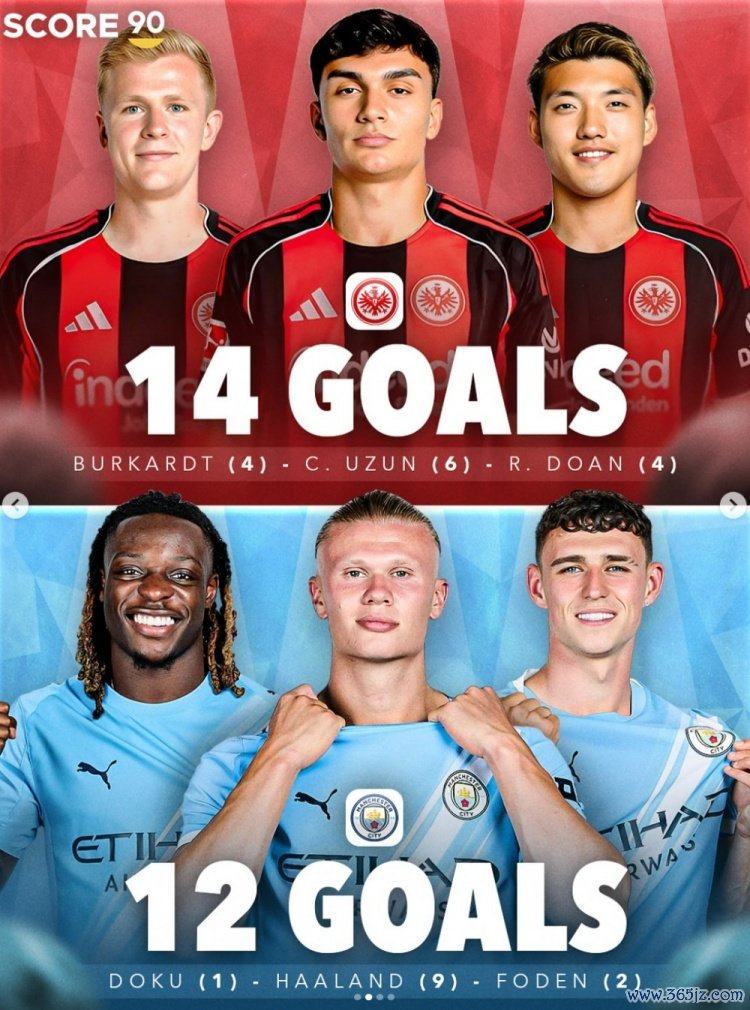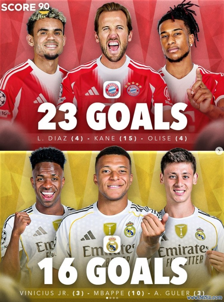 9月30日讯 Score90盘点了五大职业联赛 球队三人组本赛季目前在各项赛事得分 榜,其中拜仁三将共打进23球居首, 排球资讯直播吧具体如下: