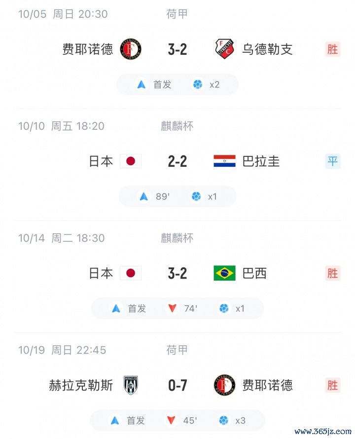 10月20日讯 荷甲第9轮,费耶诺德7-0大胜赫拉克勒斯,日本前场球员上田绮世上半场就完成独中三元。