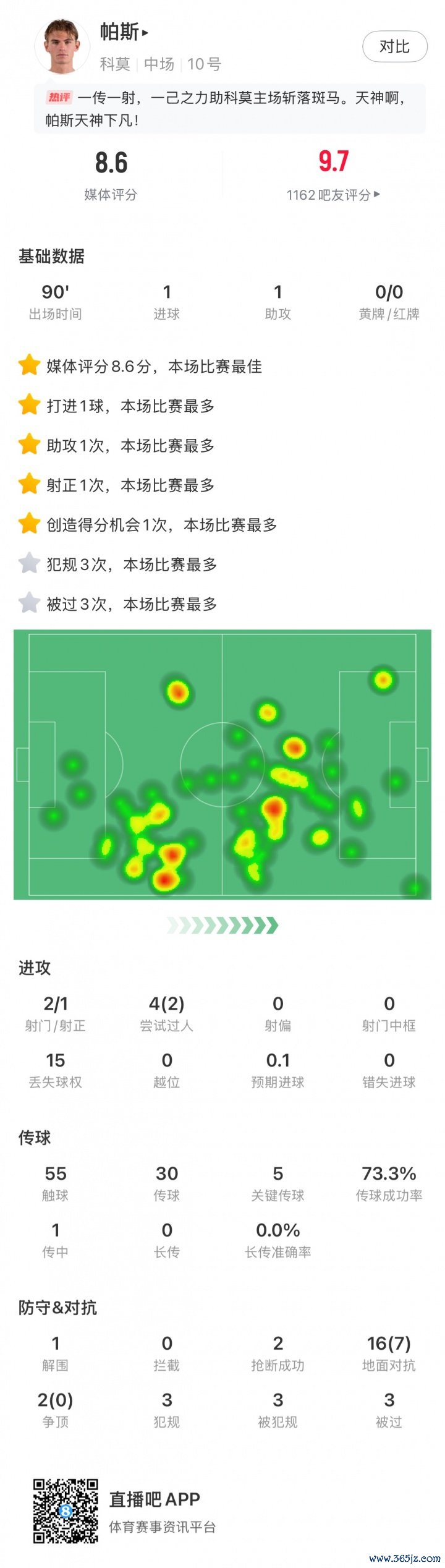 科莫1-1热那亚,帕斯14次地面对峙 成功5次