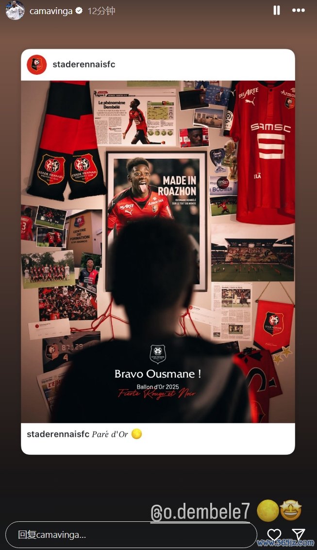 与登贝莱同样出身雷恩青训的卡马文加转发了雷恩的海报祝贺登贝莱获奖皇马11-1巴萨。
