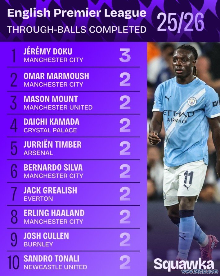 9月24日讯 本赛季英超战罢5轮,“Squawka”统计了所有球员成功完成直塞次数的排名,田径新闻体育直播曼城翼锋多库以3次领跑。