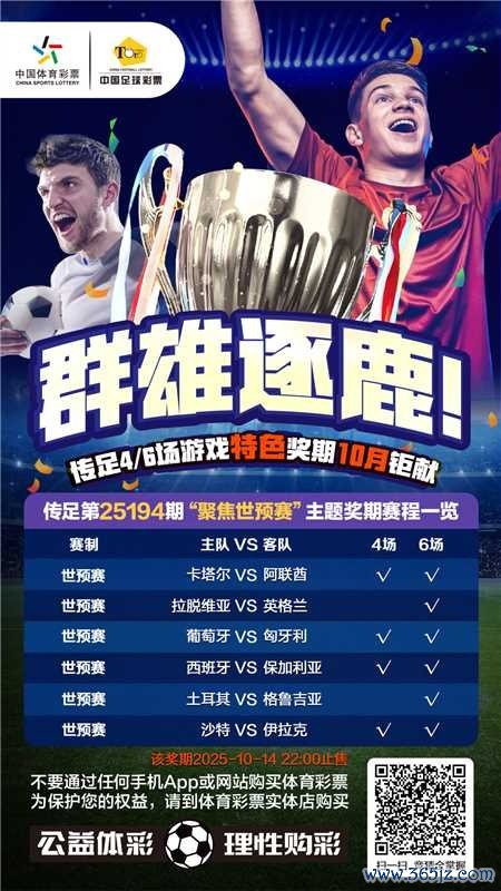 第25194期传足4/6场游戏特色奖期已经于2025年10月12日20:00开售2025欧冠最新赔冠率,将于2025年10月14日22:00停售,并于10月15日开奖,其中卡塔尔VS阿联酋、葡萄牙VS匈牙利、西班牙VS保加利亚和沙特VS伊拉克为4场得分 游戏竞猜赛事。