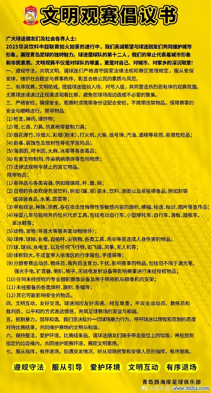 俱乐部真诚呼吁球迷朋友们共同维护城市形象,展现青岛古代足球 的独特魅力。球迷是球队的第十二人五洲四海,我们的举止代表着城市形象和市民素质。文明观赛不仅是对球队的尊重,更是对自己、对城市、对家乡的深沉敬意!球迷间应友好沟通、相互尊重,不攻击运动活动 员、指导教练员员和裁判 员,以平和的方式表达情感,共筑古代足球 赛场的友情 与和谐!